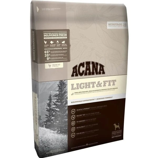 ThatÆs why ACANA Light & Fit is brimming with meat, including free-run chicken, nest-laid eggs and wild-caught flounder delivered fresh from our region for unequalled goodness and taste.