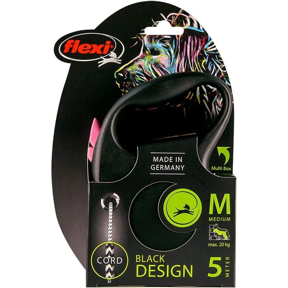 Flexi Black Design comes in three bold colours that form a striking contrast with the black housing, as well as a subtle all-black lead set off by a classic silver logo. It can be customised with the Multi Box and LED Lighting System accessories (for size S and up). With its innovative Short-Stop Braking System, it creates a high level of safety and comfort during walks.