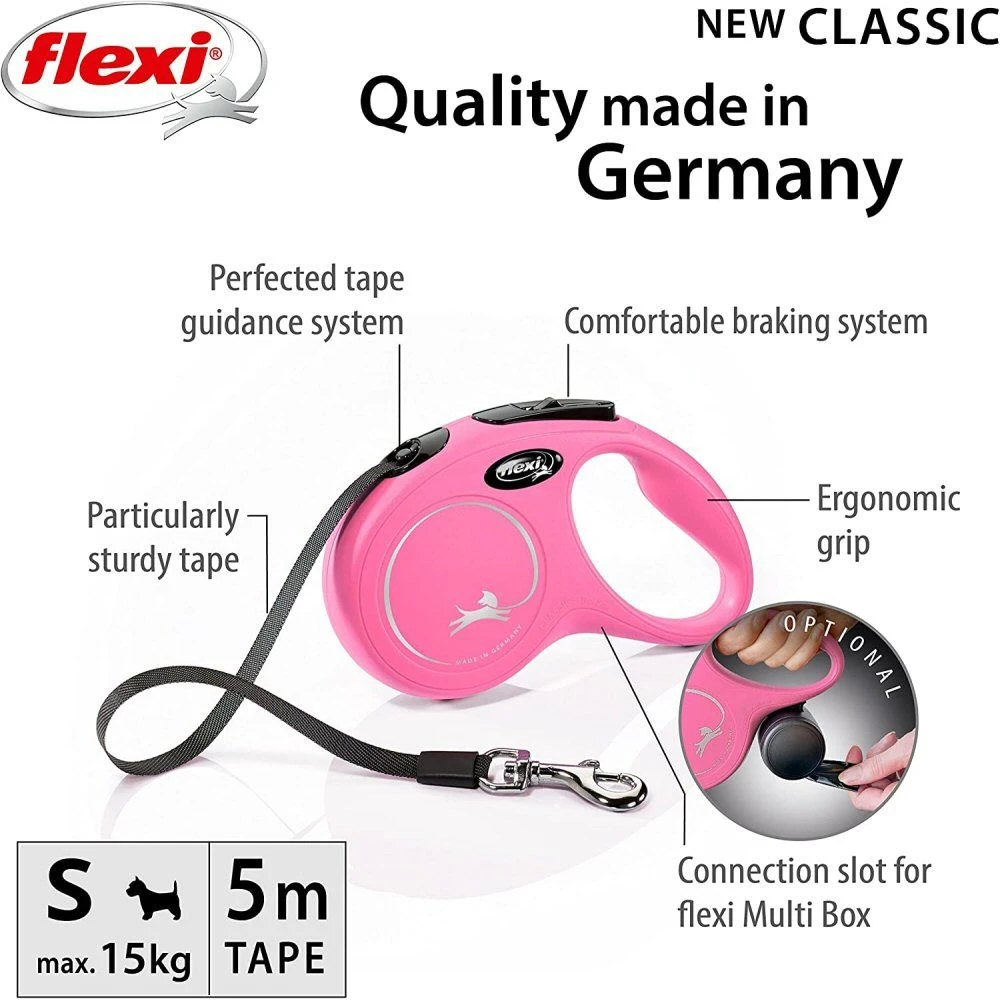 New Classic – the classic, perfect retractable lead from flexi, featuring a stylish design and an ergonomic grip handle. It can be accessorized with Multi Box and LED Lighting System (for size S and up).