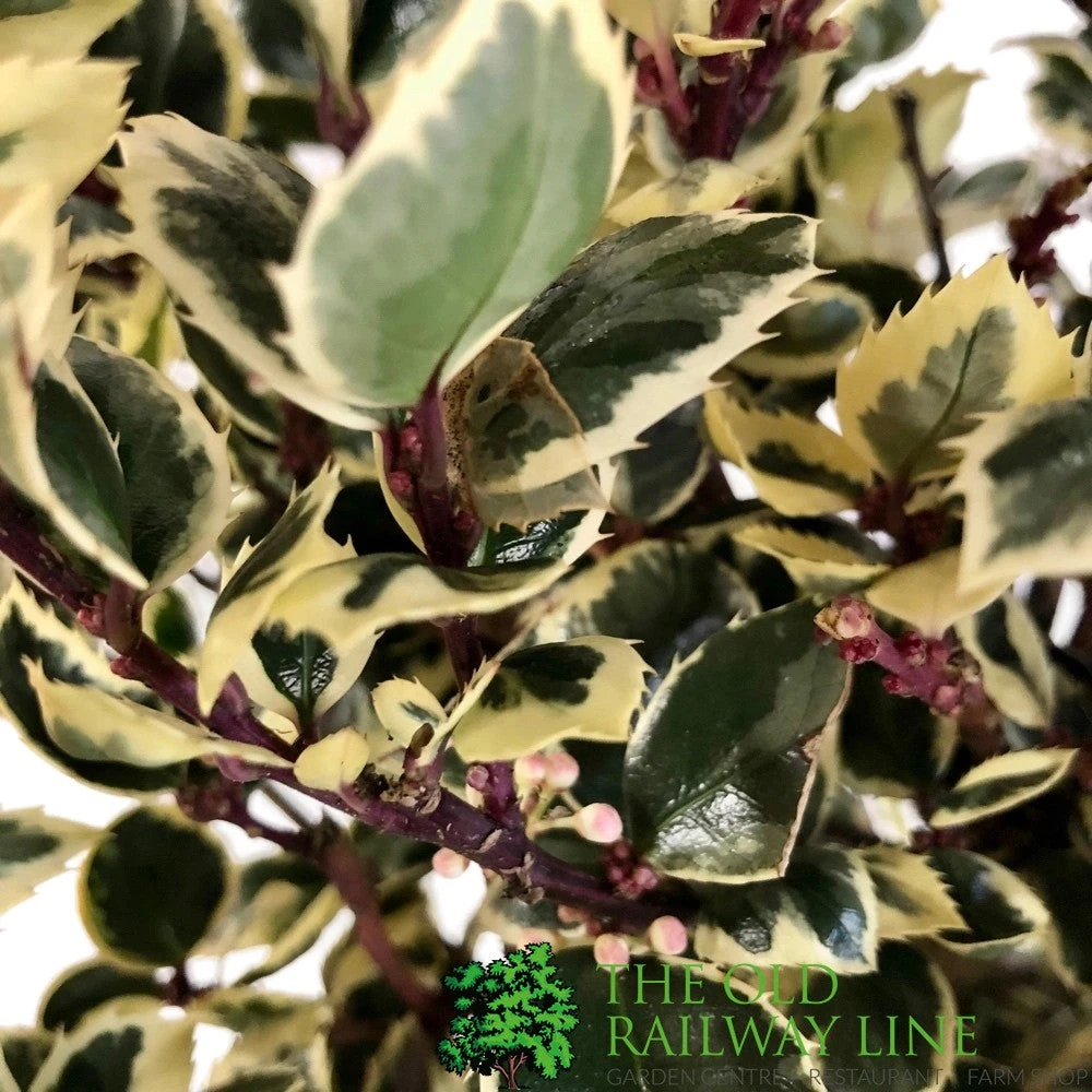 A vigorous, glossy-leaved evergreen holly with cream edging and pink winter hues. Red buds blossom into white flowers in early summer.Â